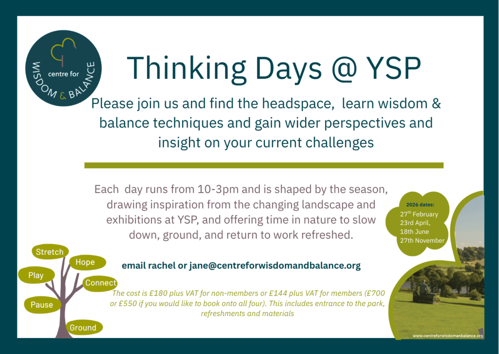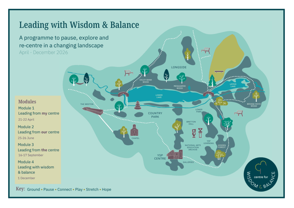 A new leadership programme, Leading with Wisdom and Balance, is launching at YSP this April and runs through to December. Created for senior leaders working amid disruption, complexity and continual change, it offers a restorative space to stay centred, grounded and quietly courageous while leading meaningful work.
