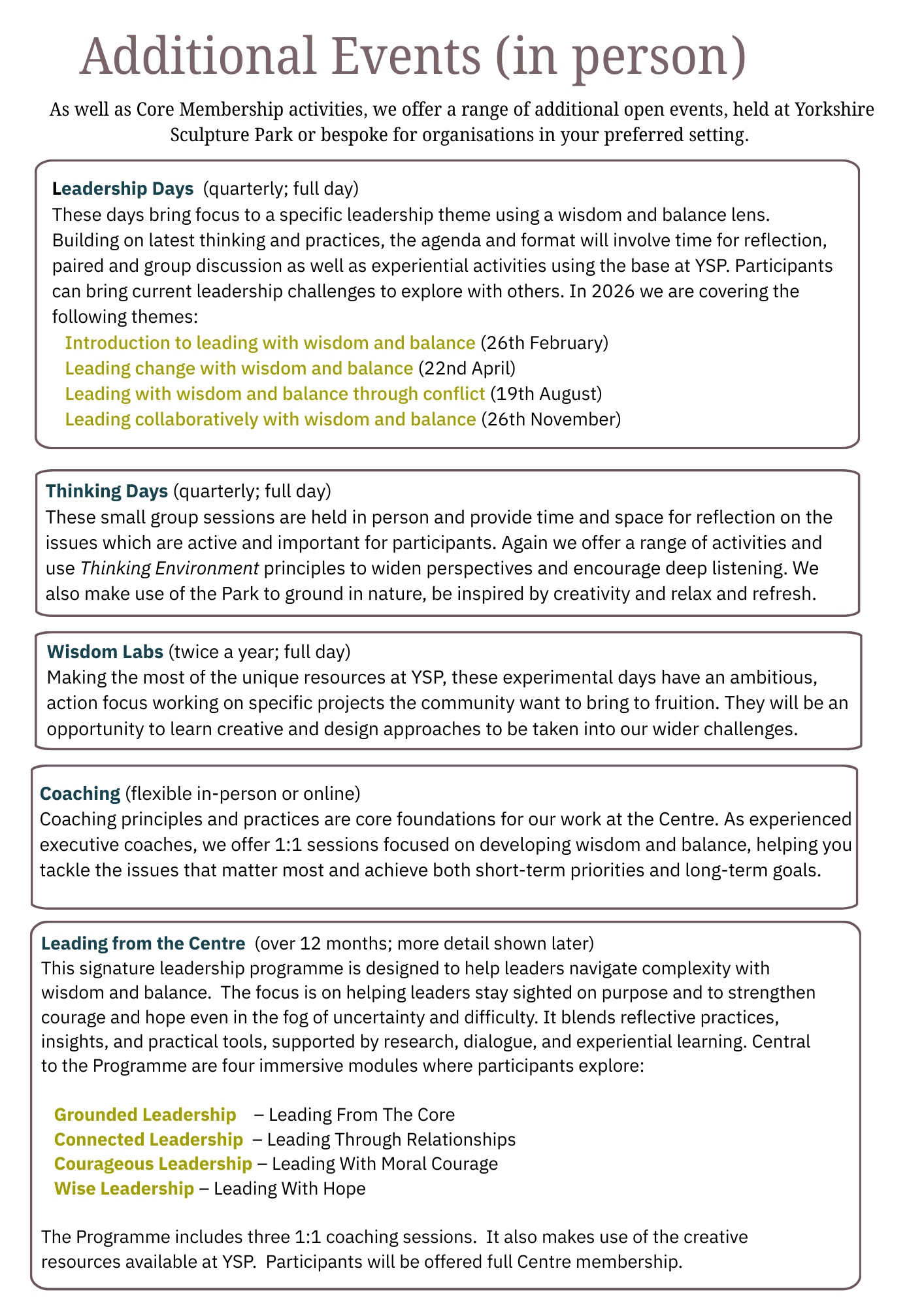 Plus: Members enjoy 20% off all additional in-person activities, including Leadership Days, Thinking Days, Wisdom Labs, and our signature Leading from the Centre programme, as well as bespoke coaching sessions.