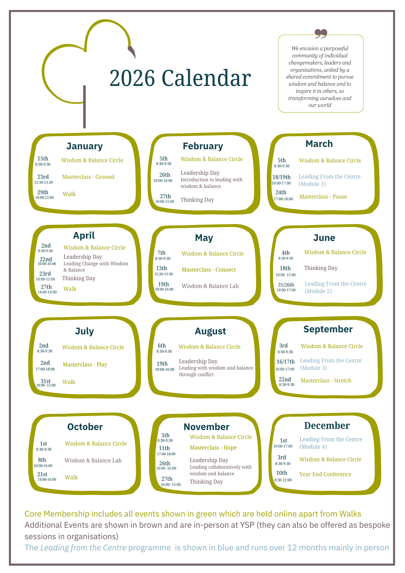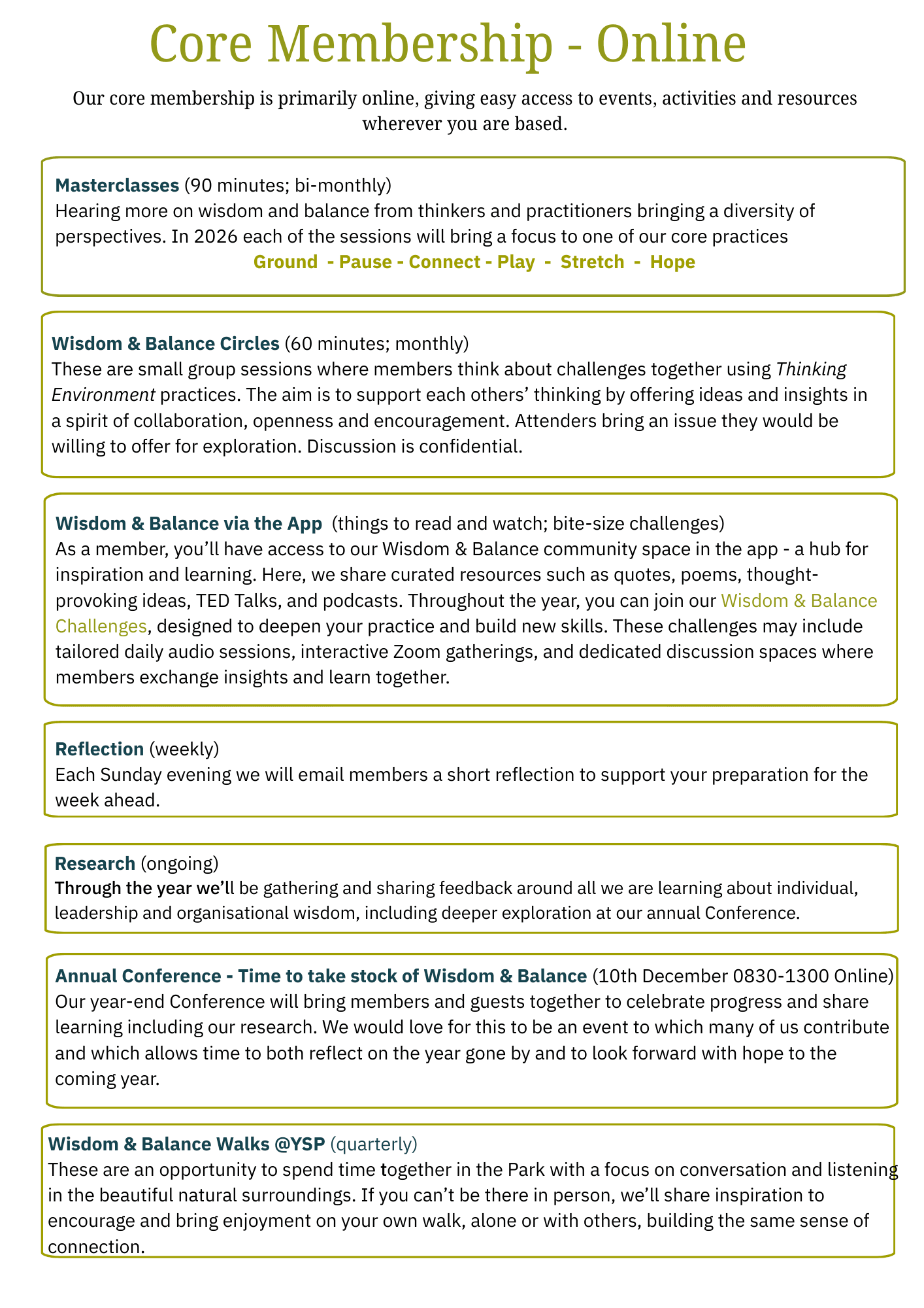 Enjoy regular online masterclasses, Wisdom & Balance Circles, weekly reflections, and our dedicated app with resources and practical challenges. You’ll also be invited to participate in research, attend our Annual Conference, and join occasional walks at YSP. Together, we create space for stillness, clarity, and connection in a busy world—transforming ourselves and inspiring change around us.
